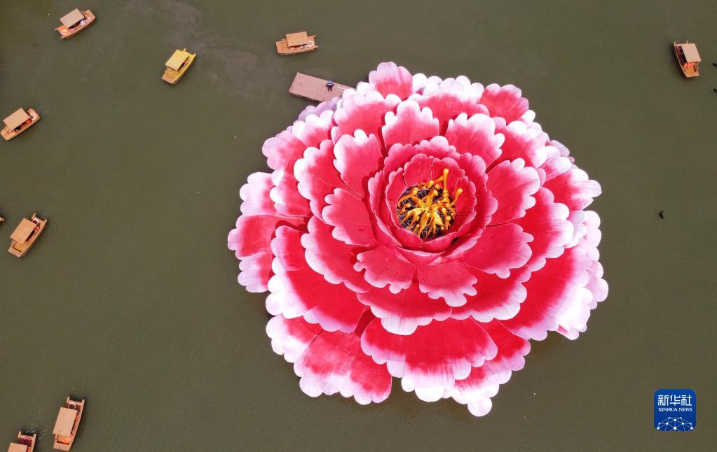 這是洛陽(yáng)市隋唐城遺址植物園巨型牡丹景觀(guān)造型(無(wú)人機照片,2023年4月16日攝)。