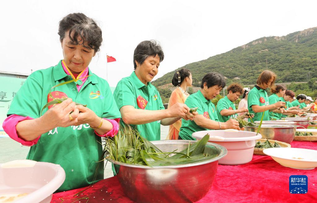 6月18日,在江蘇連云港市連云區高公島凰窩風(fēng)景區,人們在端午民俗文化活動(dòng)上參加包粽子比賽。