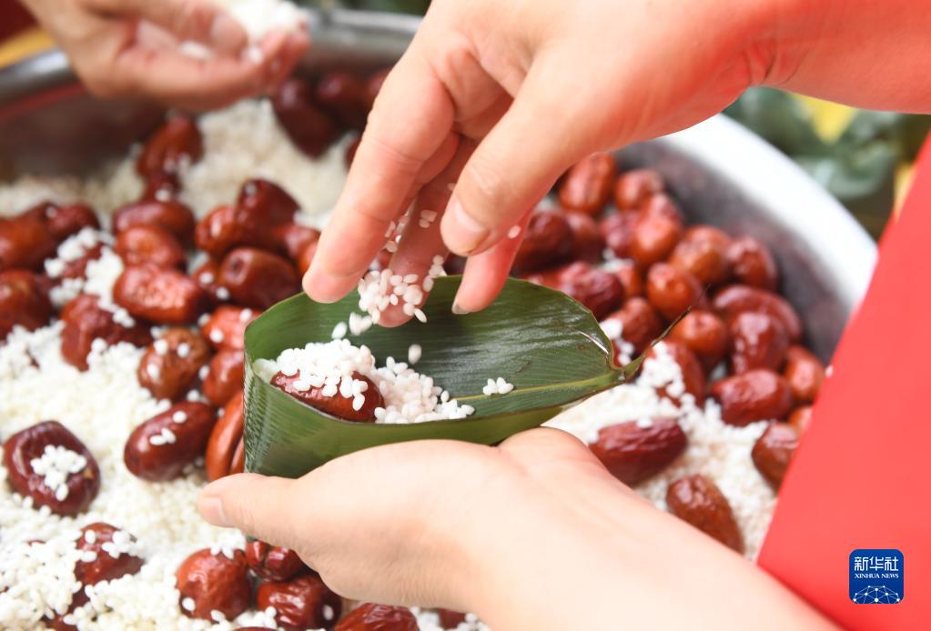 6月18日,在河北省石家莊新樂(lè )市建安小區,志愿者和居民一起包粽子。
