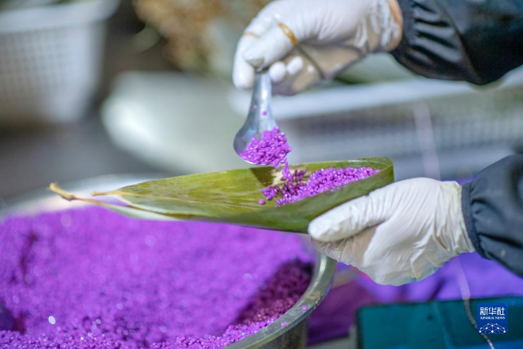 6月18日,在云南省文山壯族苗族自治州丘北縣一食品加工企業(yè),工人在制作五色粽子。