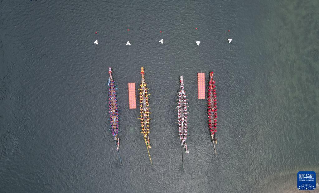 6月21日,龍舟隊在安徽省涇縣桃花潭鎮參加龍舟賽(無(wú)人機照片)。