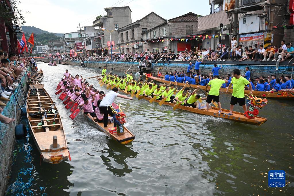 福州市長(cháng)樂(lè )區三溪村,龍舟傍晚時(shí)分在穿村而過(guò)的小溪中競渡迎端午(6月20日攝)。