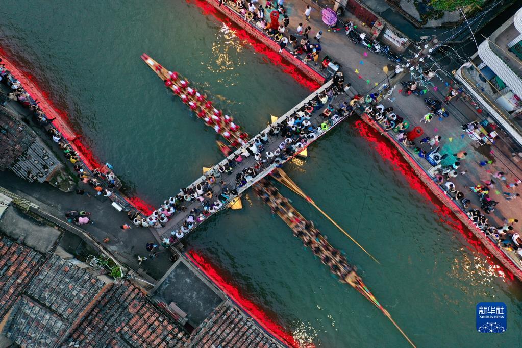 福州市長(cháng)樂(lè )區三溪村,龍舟在穿村而過(guò)的小溪中競渡迎端午(6月18日攝,無(wú)人機照片)。