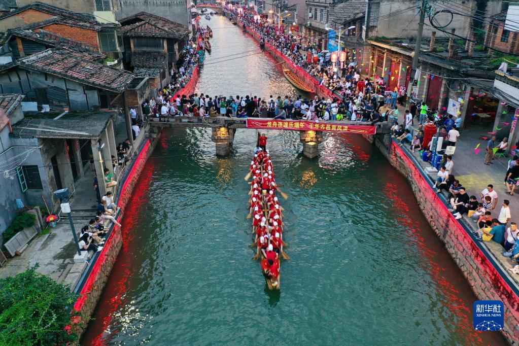 端午來(lái)臨,福建省福州市長(cháng)樂(lè )區三溪村獨有的龍舟夜渡迎端午活動(dòng)如約而至。夜幕降臨,華燈初上,隨著(zhù)鼓聲響起,數十條龍舟陸續出現在古村的小溪中,清澈的水面上船槳翻飛、龍舟飛馳,夾岸觀(guān)眾人頭攢動(dòng),加油吶喊不絕于耳,一派熱鬧景象。夜賽龍舟習俗在三溪村已經(jīng)沿襲600多年,每年端午節前后,村里的男女老少都會(huì )相聚一起夜競龍舟,借此祈盼風(fēng)調雨順、平安健康。