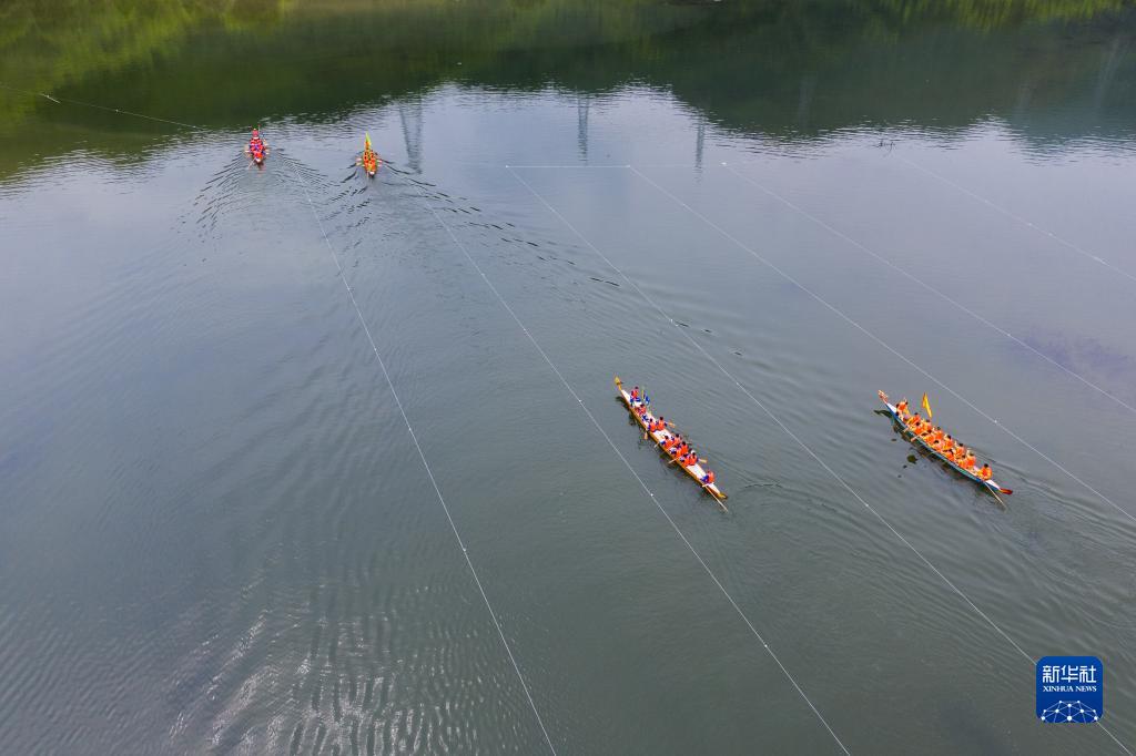 6月21日,在湖源鄉窈口村的回龍湖,村民們在參加劃龍舟比賽(無(wú)人機照片)。
