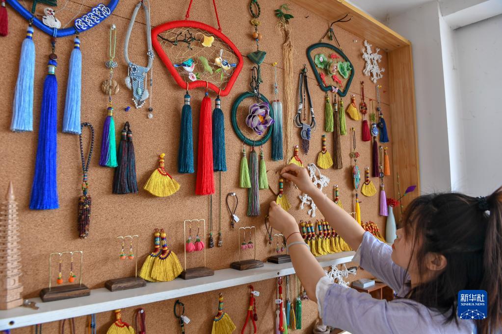 6月20日,在吉林省長(cháng)春市,徐曉雪整理繩結工藝品。