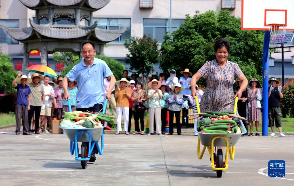 6月21日,在湖州市長(cháng)興縣和平鎮長(cháng)崗村,村民在進(jìn)行獨輪車(chē)運蔬菜比賽。