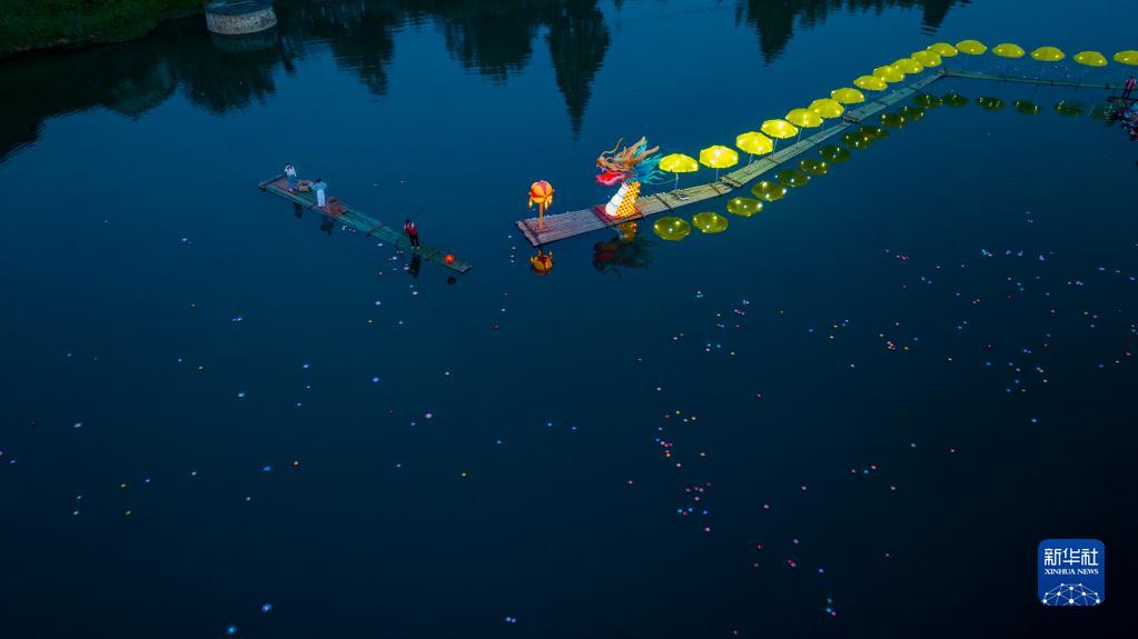 這是6月16日在安徽省寧國市胡樂(lè )鎮西津河拍攝的“河燈”和“龍燈”(無(wú)人機照片)。