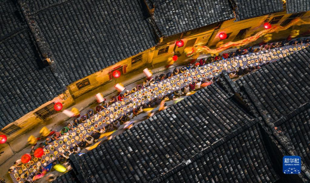 6月16日,村民舞著(zhù)龍燈經(jīng)過(guò)安徽省寧國市胡樂(lè )鎮老街上舉辦的長(cháng)桌宴(無(wú)人機照片)。