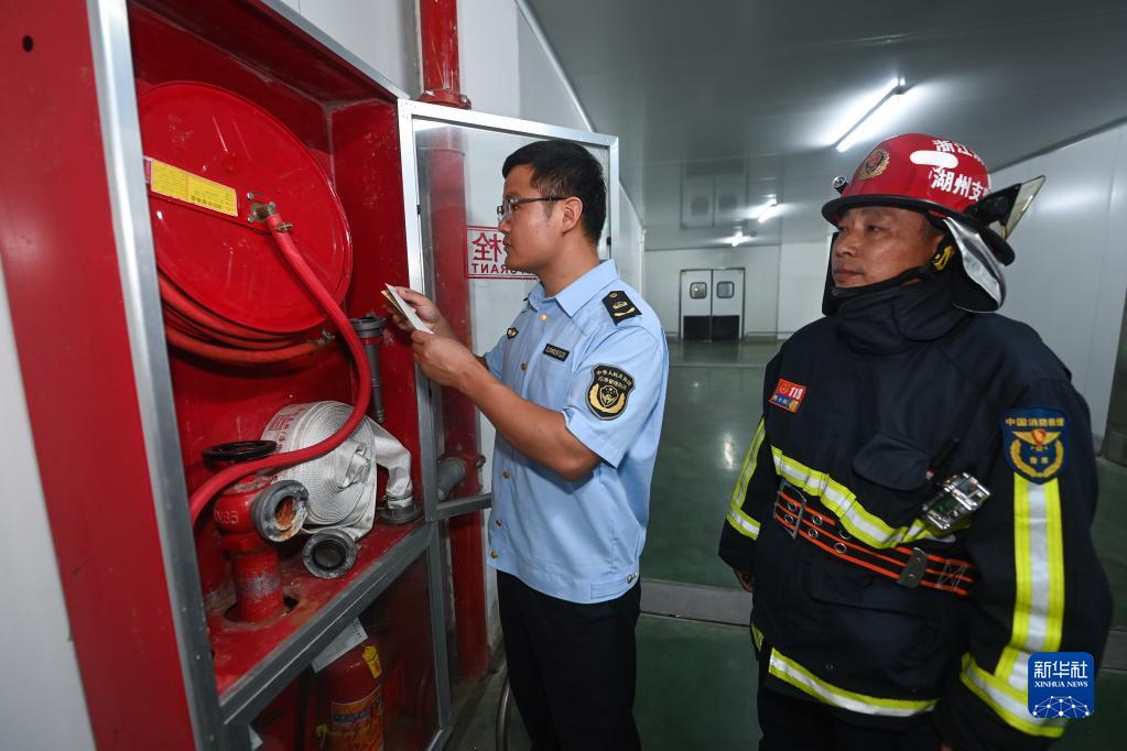 6月21日,道場(chǎng)鄉應急管理執法部門(mén)的工作人員(左)和消防部門(mén)工作人員對企業(yè)消防設施進(jìn)行檢查。