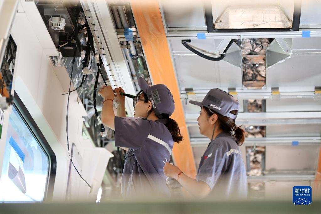 工作人員在天津中車(chē)唐車(chē)軌道車(chē)輛有限公司的組裝車(chē)間內進(jìn)行作業(yè)(6月20日攝)。