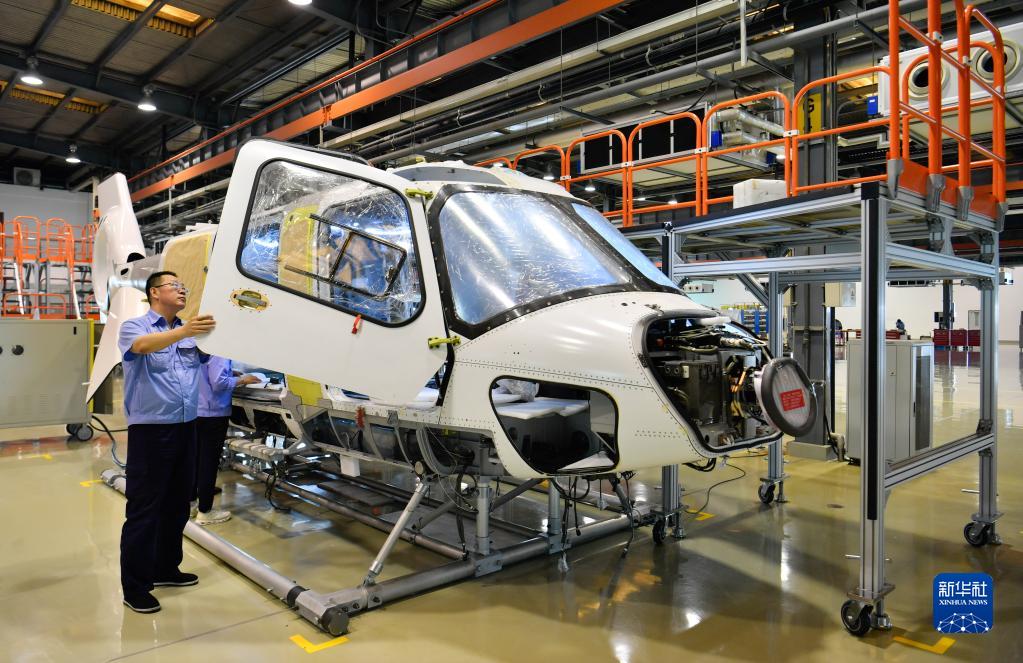 6月20日,工作人員在航空工業(yè)天津直升機有限責任公司組裝生產(chǎn)一架AC332型民用直升機。