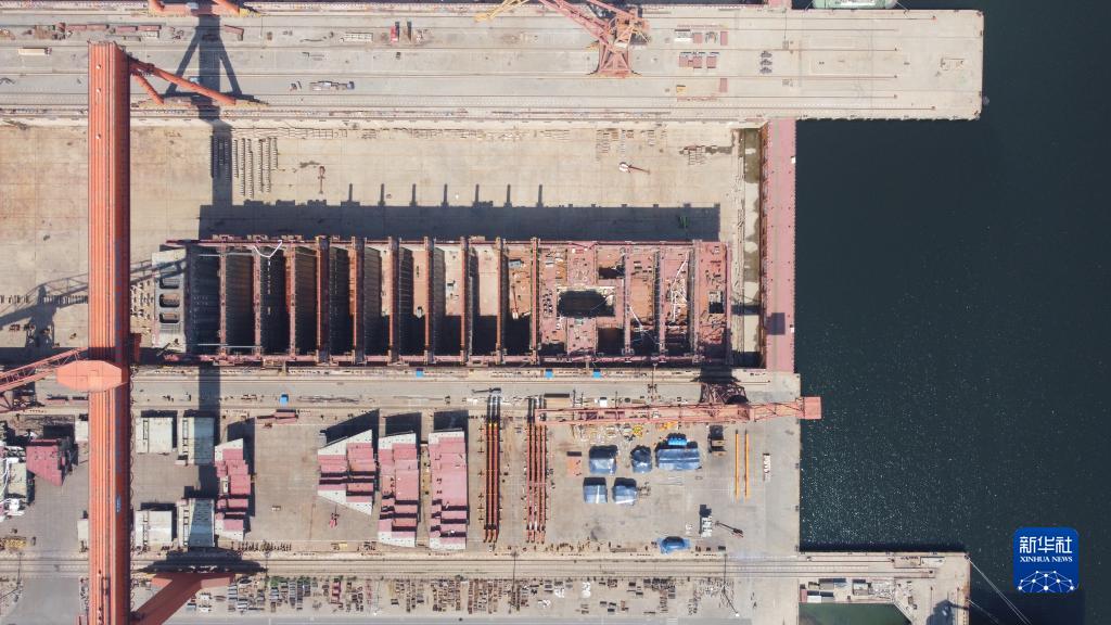 6月21日,在中船(天津)船舶制造有限公司廠(chǎng)區,船塢內正在建造一艘大型集裝箱船(無(wú)人機照片)。