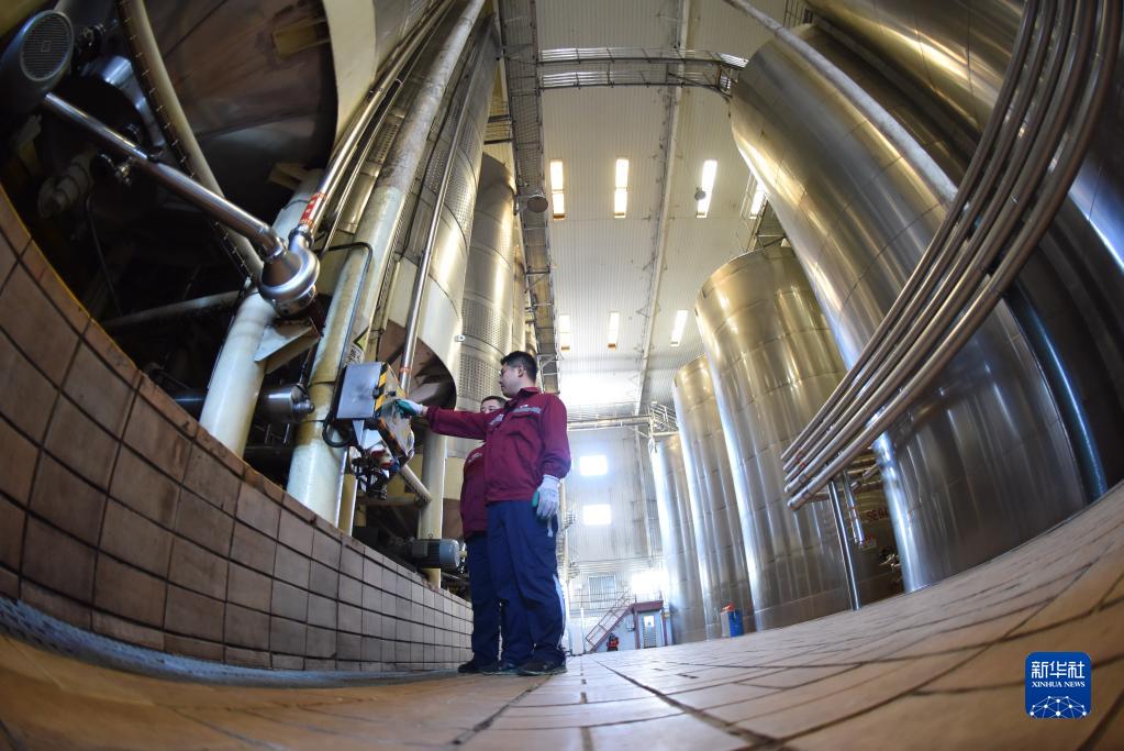 6月21日,在河北省懷來(lái)縣長(cháng)城葡萄酒廠(chǎng),兩名工人在儲酒庫里操作設備。