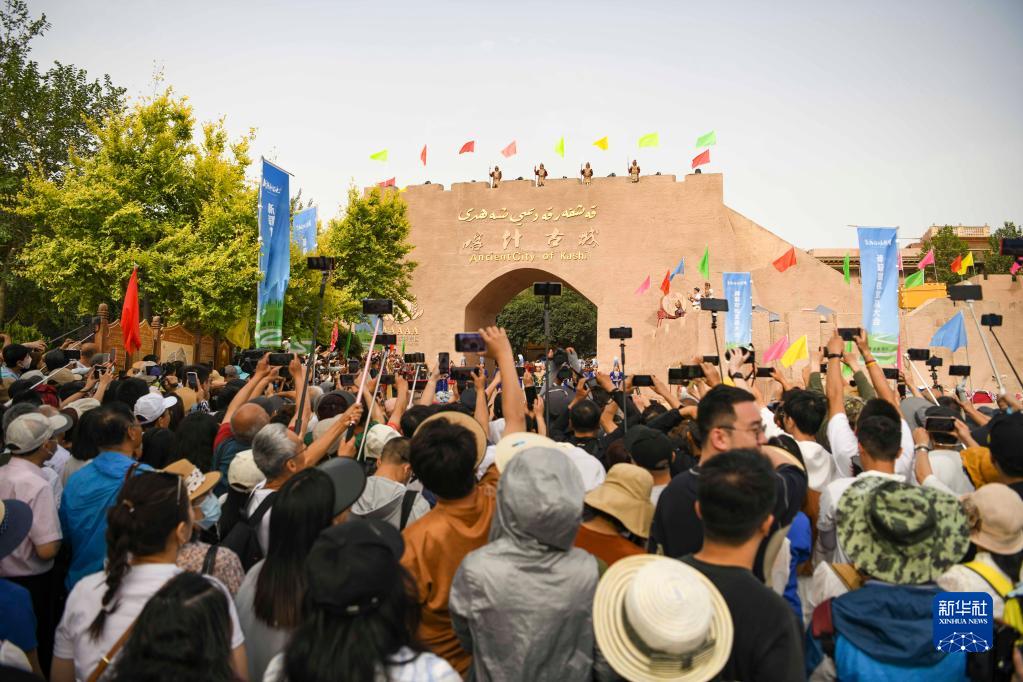 游客在新疆喀什古城景區東門(mén)觀(guān)看開(kāi)城儀式表演(6月13日攝)。新華社記者 胡虎虎 攝