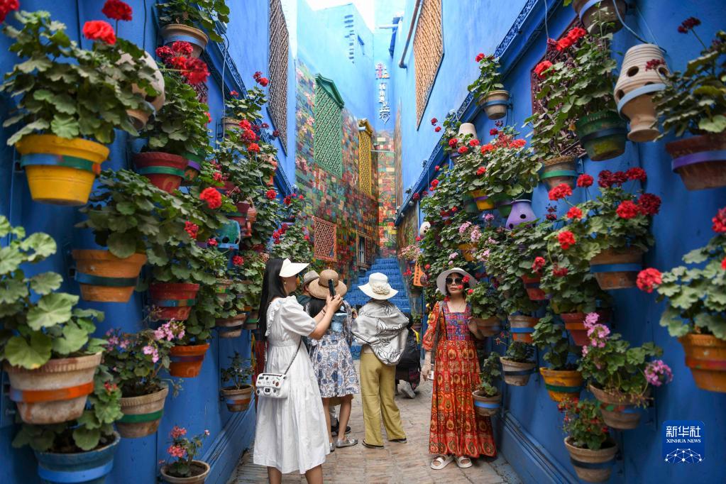 人們在新疆喀什古城景區彩虹巷內游玩拍照(6月14日攝)。新華社記者 胡虎虎 攝