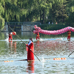 6月22日,獨竹漂表演者在北京圓明園九州景區的后湖進(jìn)行水上表演。