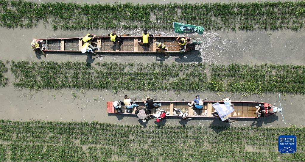 6月22日,參賽者在沈陽(yáng)市沈北新區興隆臺錫伯族鎮稻田的泥地中劃龍舟 (無(wú)人機照片) 。