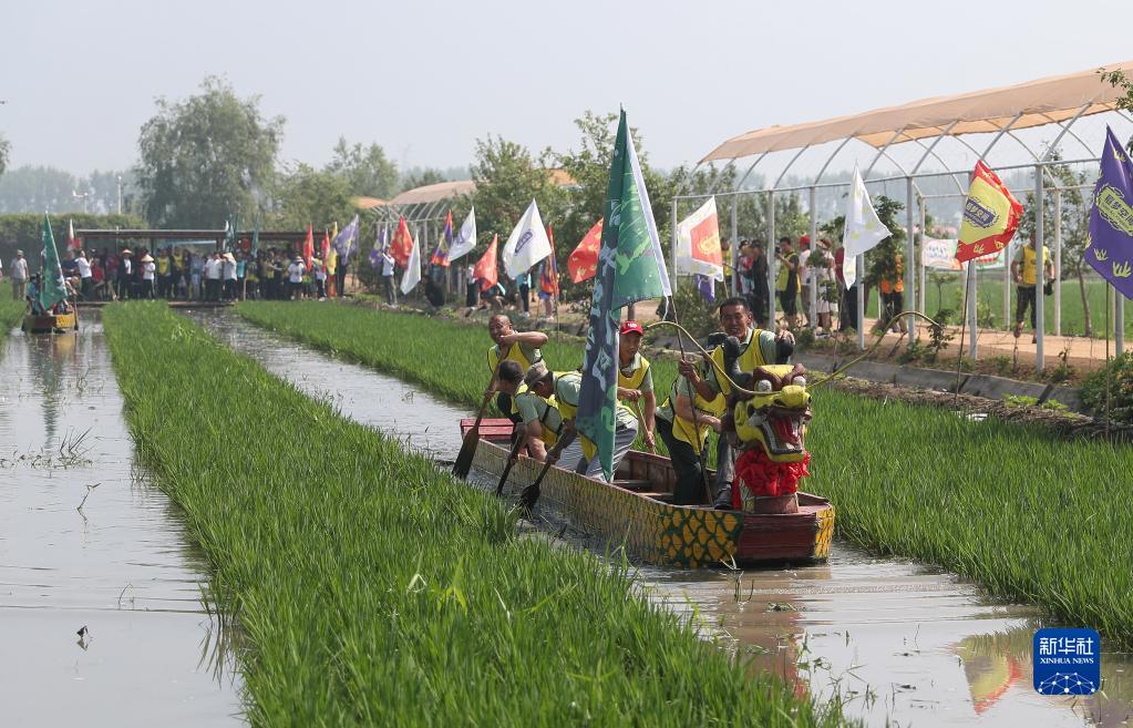 6月22日,參賽者在沈陽(yáng)市沈北新區興隆臺錫伯族鎮稻田的泥地中劃龍舟。