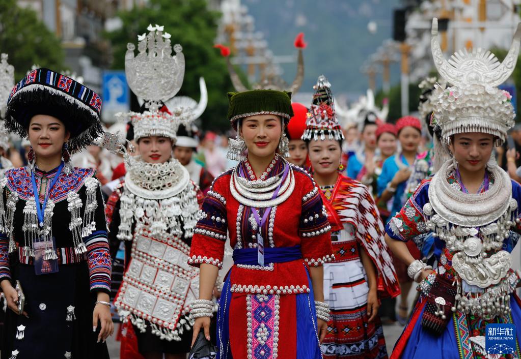 6月22日,在貴州省黔東南苗族侗族自治州施秉縣舉行的獨木龍舟節上,少數民族同胞身著(zhù)盛裝進(jìn)行巡游。