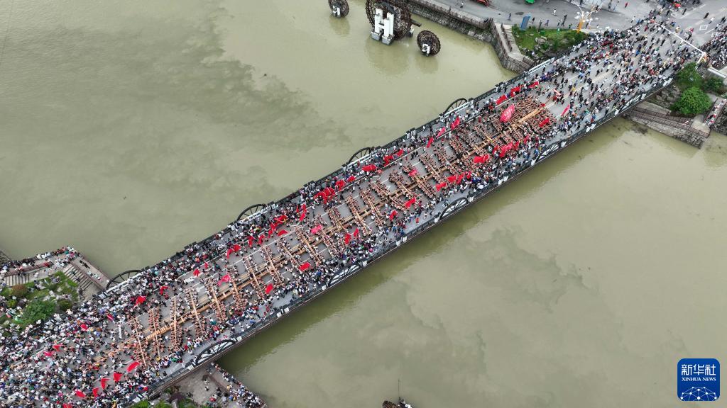 6月22日,在貴州省黔東南苗族侗族自治州施秉縣舉行的獨木龍舟節上,人們參與獨木龍舟巡游活動(dòng)(無(wú)人機照片)。