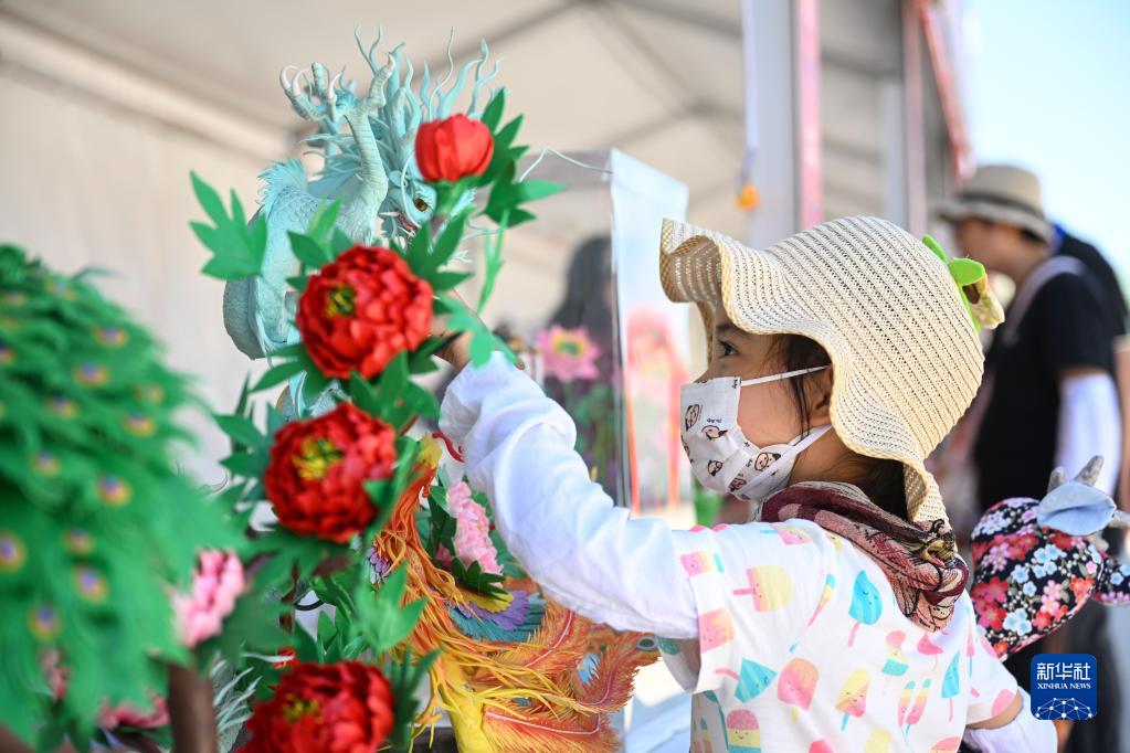 6月22日,兒童在內蒙古烏蘭察布市卓資縣龍勝公園欣賞面塑。