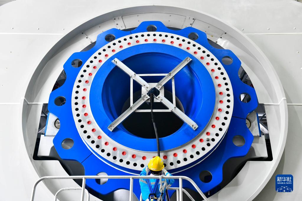 6月21日,在乳山市遠景能源零碳產(chǎn)業(yè)園,工作人員在海上風(fēng)機前作業(yè)。