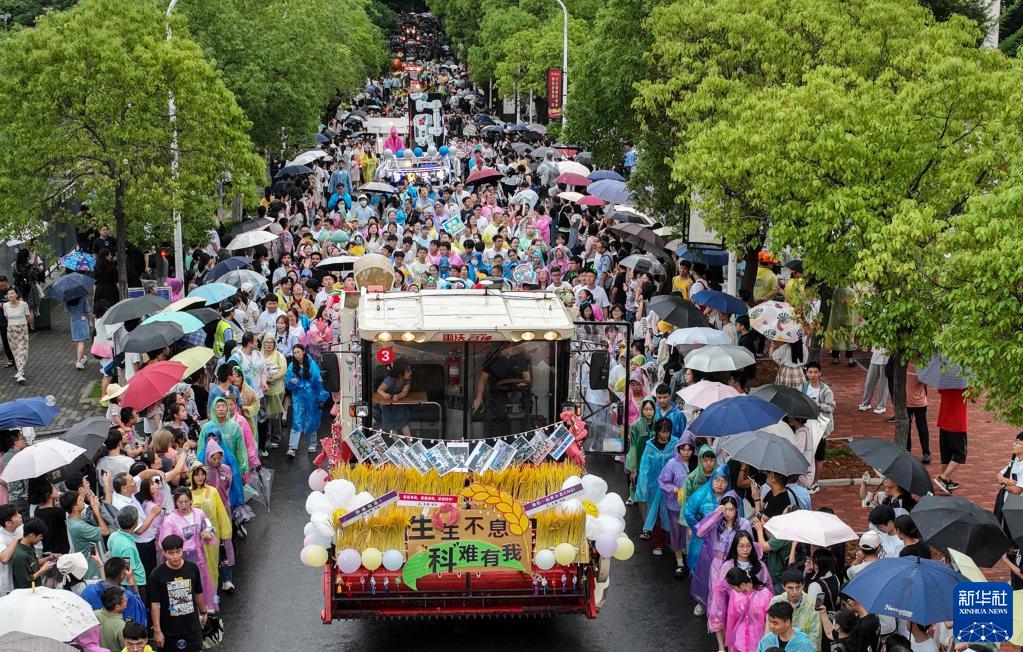 當日,為迎接畢業(yè)季,華中農業(yè)大學(xué)舉行了一場(chǎng)花車(chē)巡游,學(xué)生們簇擁著(zhù)由現代農機裝備組成的花車(chē)隊伍,在校園里巡游,慶祝畢業(yè)、致敬青春。