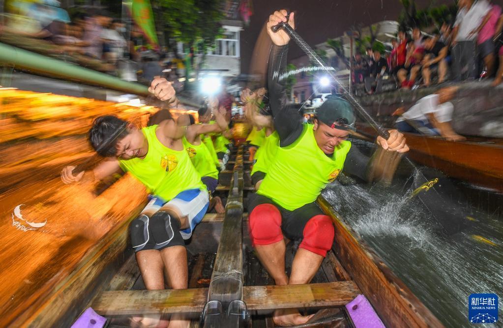 佛山疊滘東勝村的“扒仔”(槳手)在端午前堅持每天夜晚訓練,以求能在端午龍船漂移賽中展示最佳狀態(tài)(6月16日攝)。