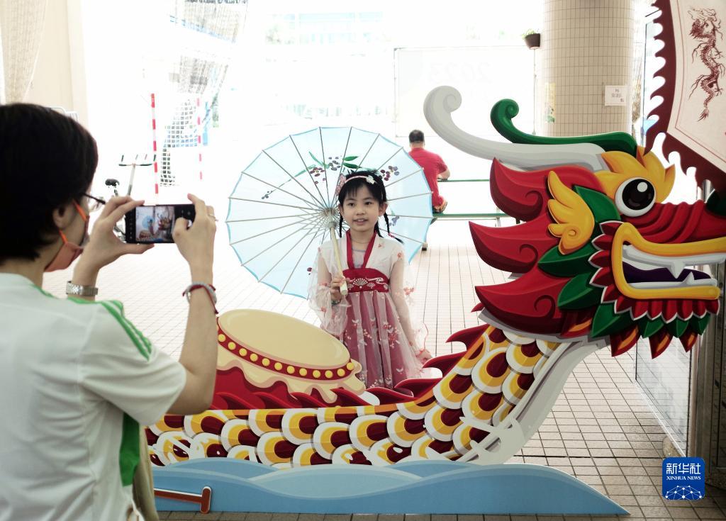 在香港漢華中學(xué),一位小朋友身著(zhù)漢服,拍照留念(6月18日攝)。