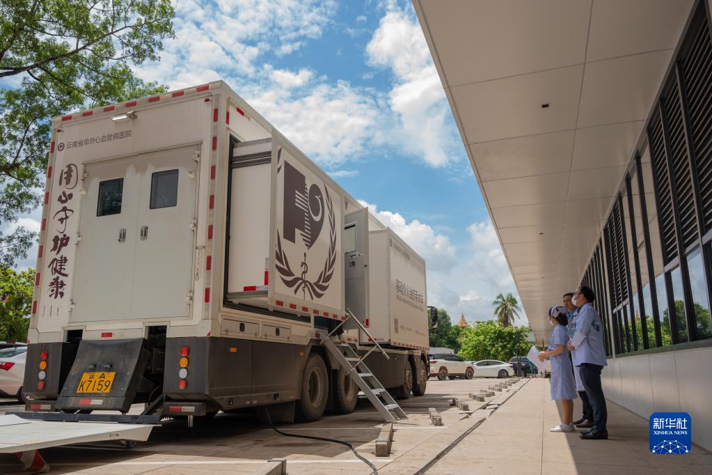 這是6月20日在老撾首都萬(wàn)象瑪霍索醫院外拍攝的移動(dòng)介入治療手術(shù)車(chē)。