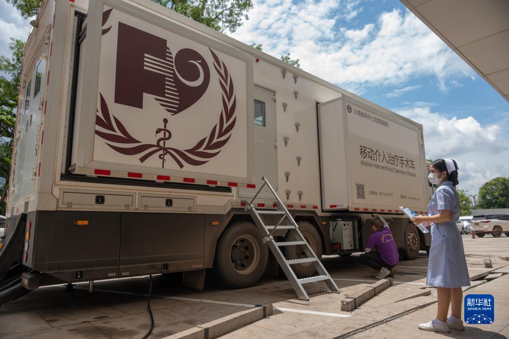 這是6月20日在老撾首都萬(wàn)象瑪霍索醫院外拍攝的移動(dòng)介入治療手術(shù)車(chē)。