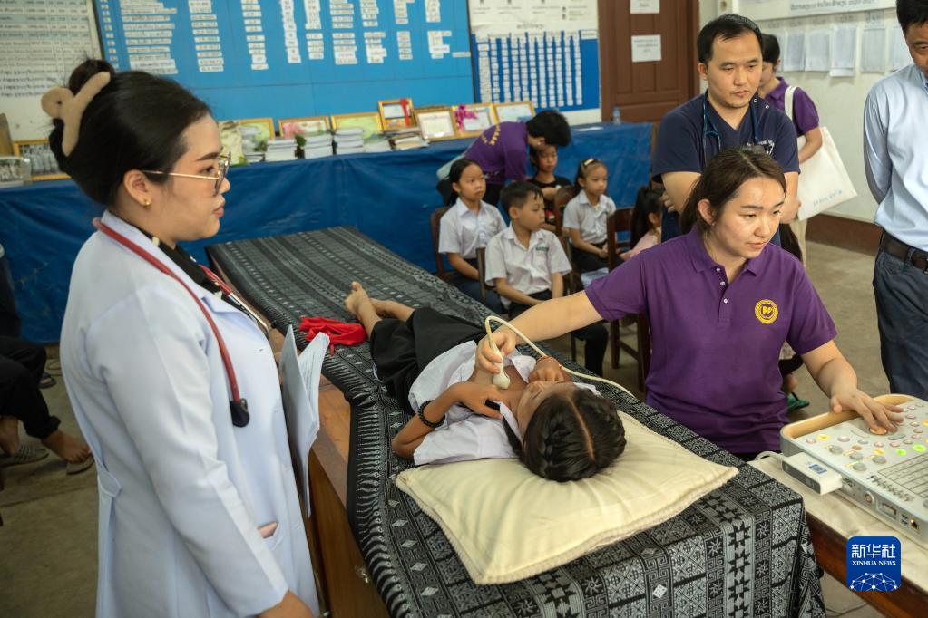 6月17日,在老撾北部瑯勃拉邦,中國醫療組對當地兒童進(jìn)行先心病免費篩查。