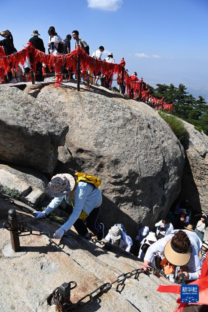 6月23日是端午小長(cháng)假的第二天,在西岳華山,游客在工作人員的引導下有序登山,領(lǐng)略“奇險天下第一山”風(fēng)光。