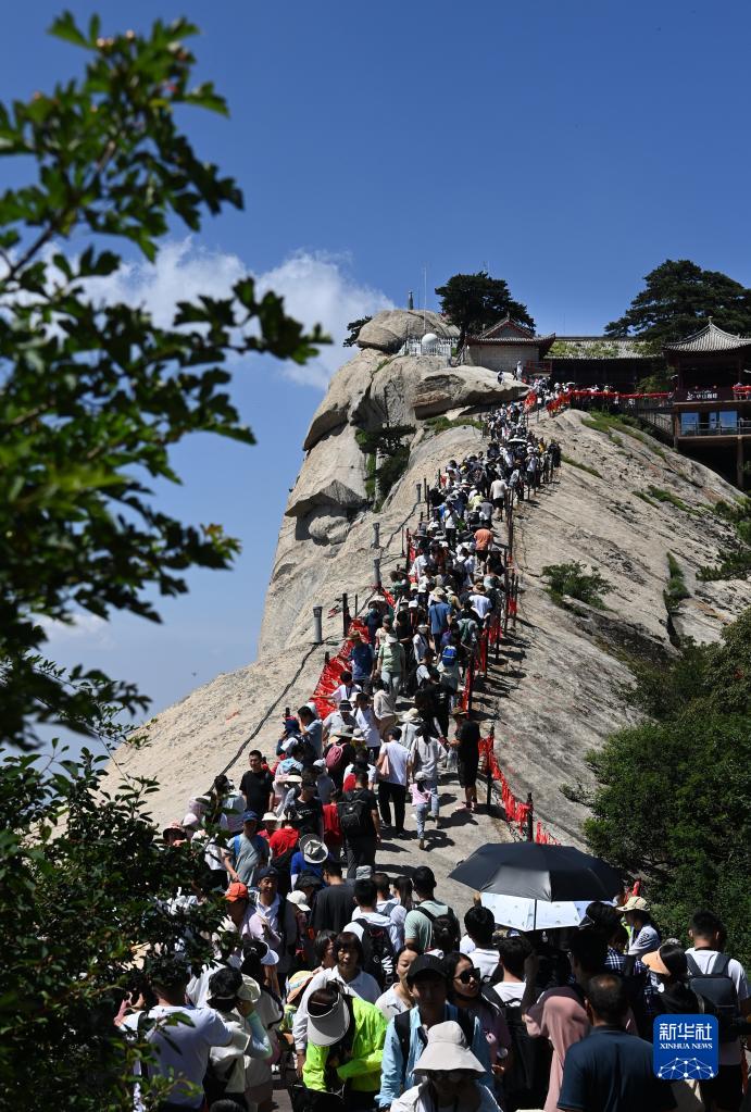 6月23日是端午小長(cháng)假的第二天,在西岳華山,游客在工作人員的引導下有序登山,領(lǐng)略“奇險天下第一山”風(fēng)光。