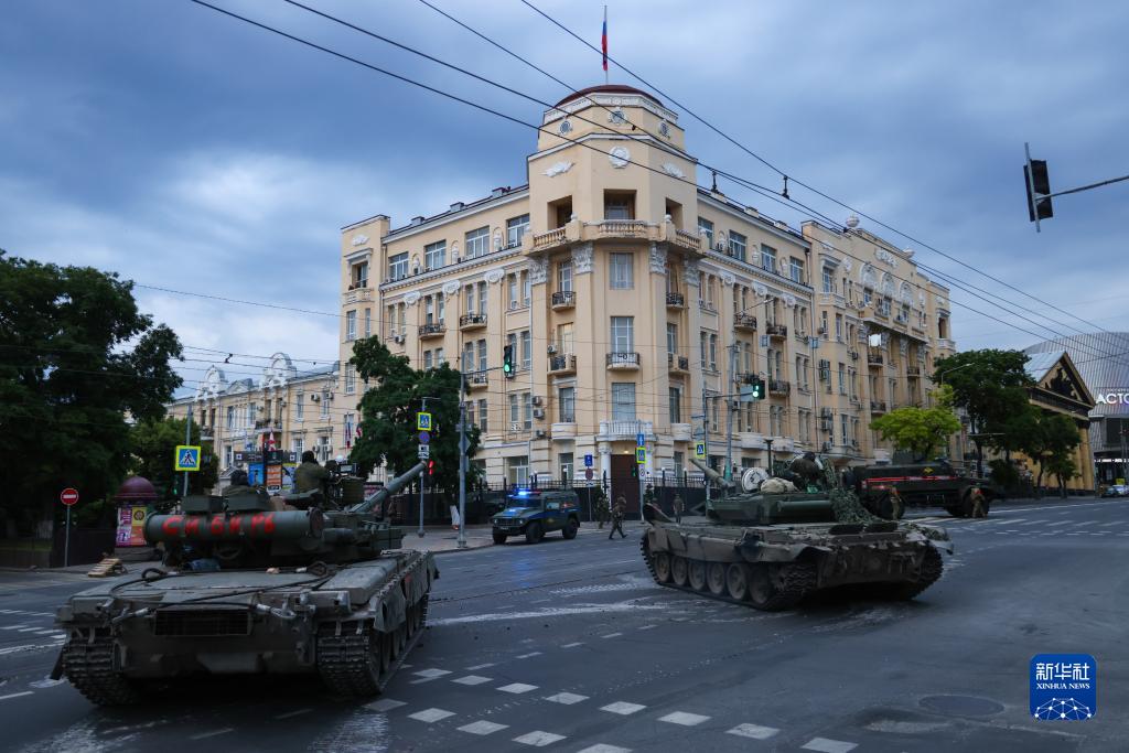 6月24日,在俄羅斯頓河畔羅斯托夫,隸屬瓦格納組織的坦克聚集在俄南部軍區總部大樓外。