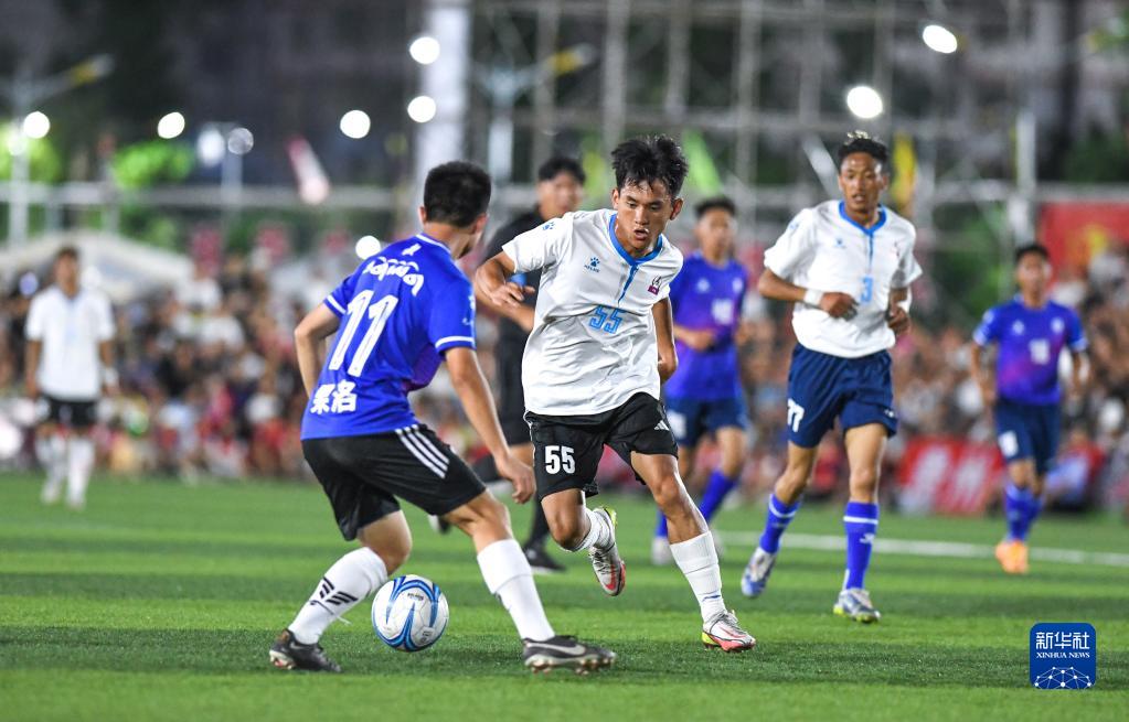 6月23日,青海省果洛州格薩爾王足球隊球員(前左)與貴州省榕江縣足球隊球員在友誼賽中拼搶。