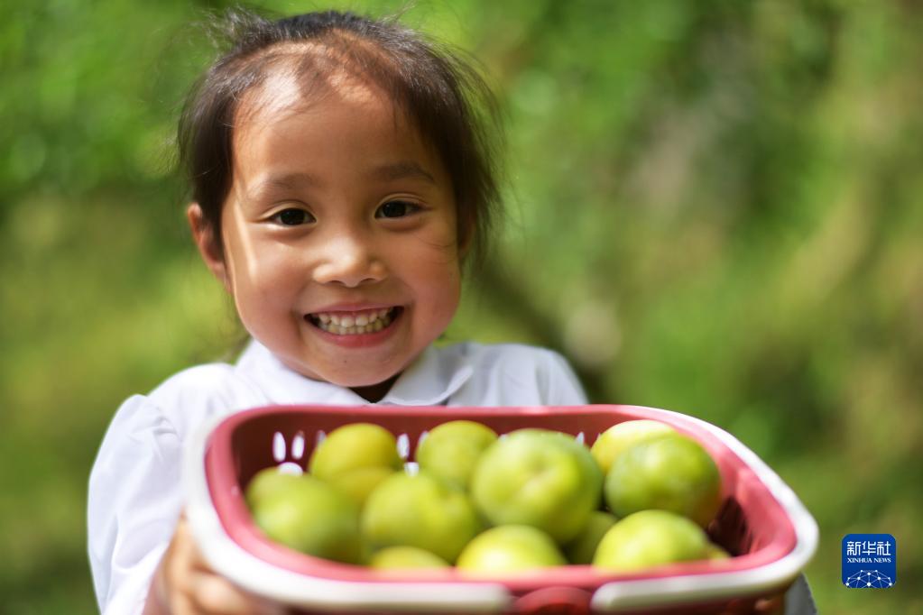 6月24日,夏國剛的女兒夏正林在貴州省開(kāi)陽(yáng)縣龍水鄉龍溪村烏江河畔的果園展示采摘的蜂糖李。