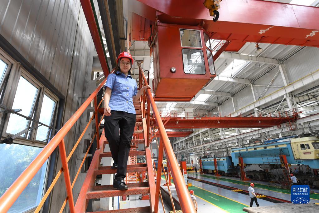 在中國鐵路太原局集團有限公司太原機務(wù)段太北檢修車(chē)間,天車(chē)司機王孟媛在工作結束后走下天車(chē)(6月15日攝)。
