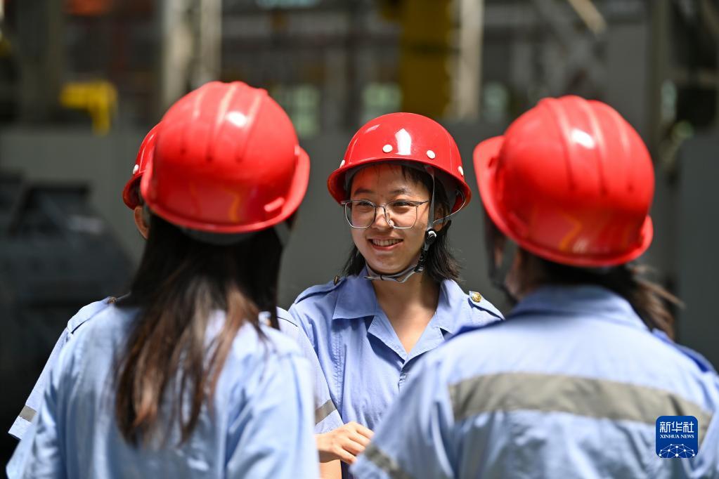 上午工作結束后,天車(chē)司機王孟媛(中)和同事們聊天(6月20日攝)。