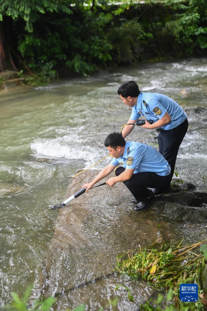 6月25日,杭州市生態(tài)環(huán)境局臨安分局的工作人員在位于臨安區的杭州亞運會(huì )場(chǎng)館周邊進(jìn)行溪水取樣。