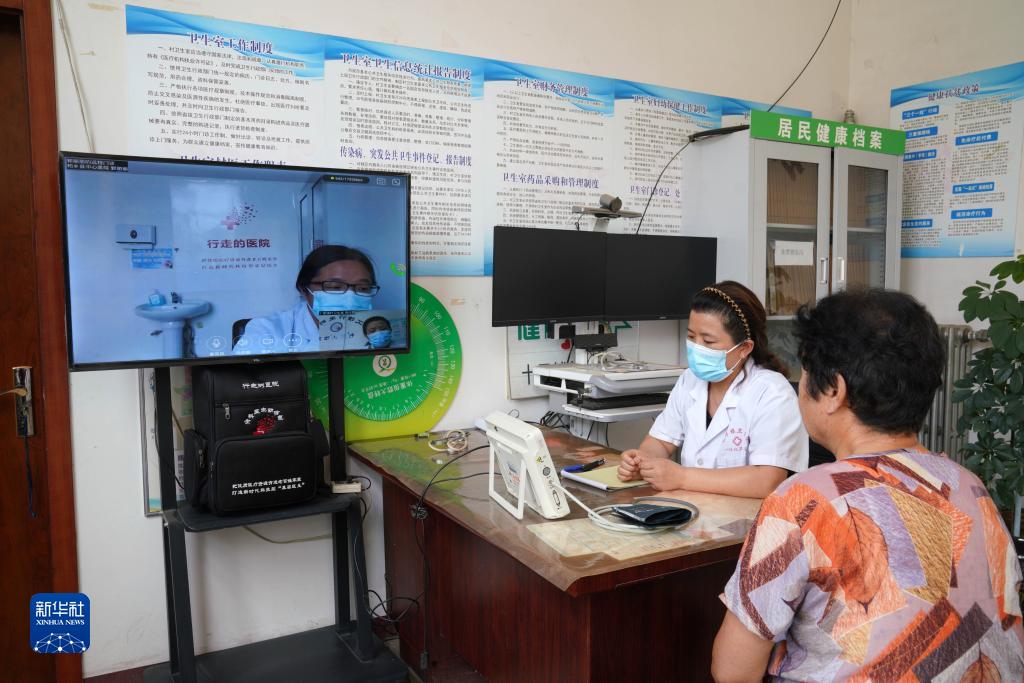 6月25日,在河北省柏鄉縣十里鋪村衛生室,村醫使用全科醫生助診包內的設備與柏鄉縣中心醫院醫生在線(xiàn)溝通患者病情。