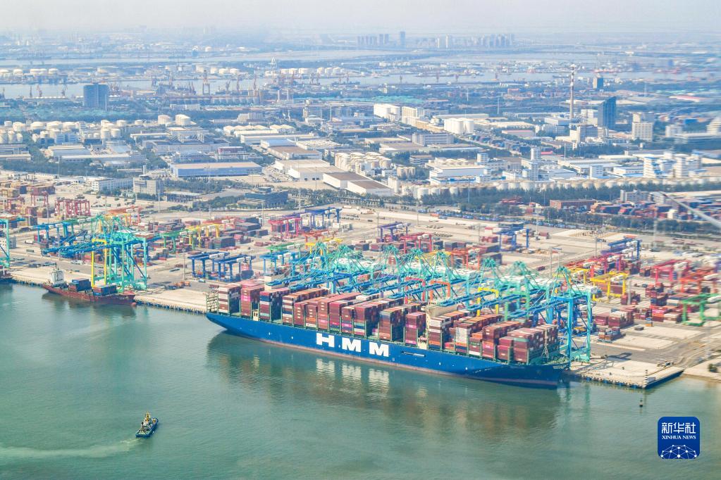 這是6月16日從直升機上拍攝的一艘??吭谔旖蚋郾苯蹍^C段智能化集裝箱碼頭的集裝箱貨輪。