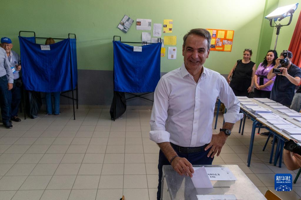 6月25日,希臘新民主黨主席基里亞科斯·米佐塔基斯在雅典一處投票站參加投票。