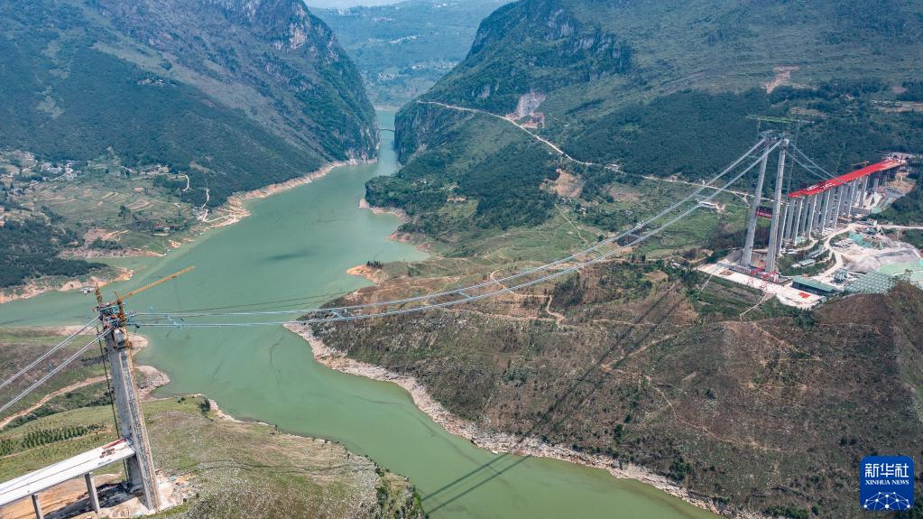6月25日,納晴高速牂牁江大橋主纜牽引順利完成(無(wú)人機照片)。