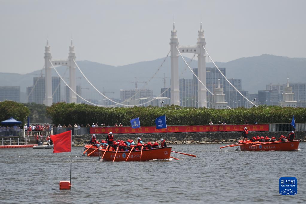 6月26日,參賽隊員在浙江舟山長(cháng)峙島攬月湖參加水上操艇比賽。