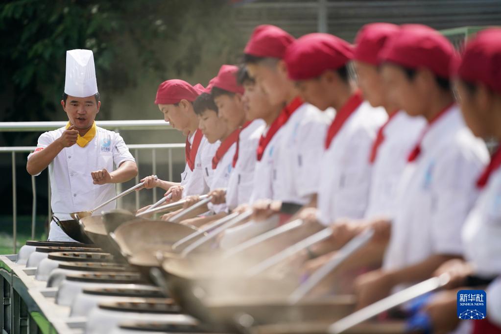 6月25日,在位于西安市藍田縣的藍田廚師學(xué)校,教師成曉強(左一)指導學(xué)生們練習翻勺。