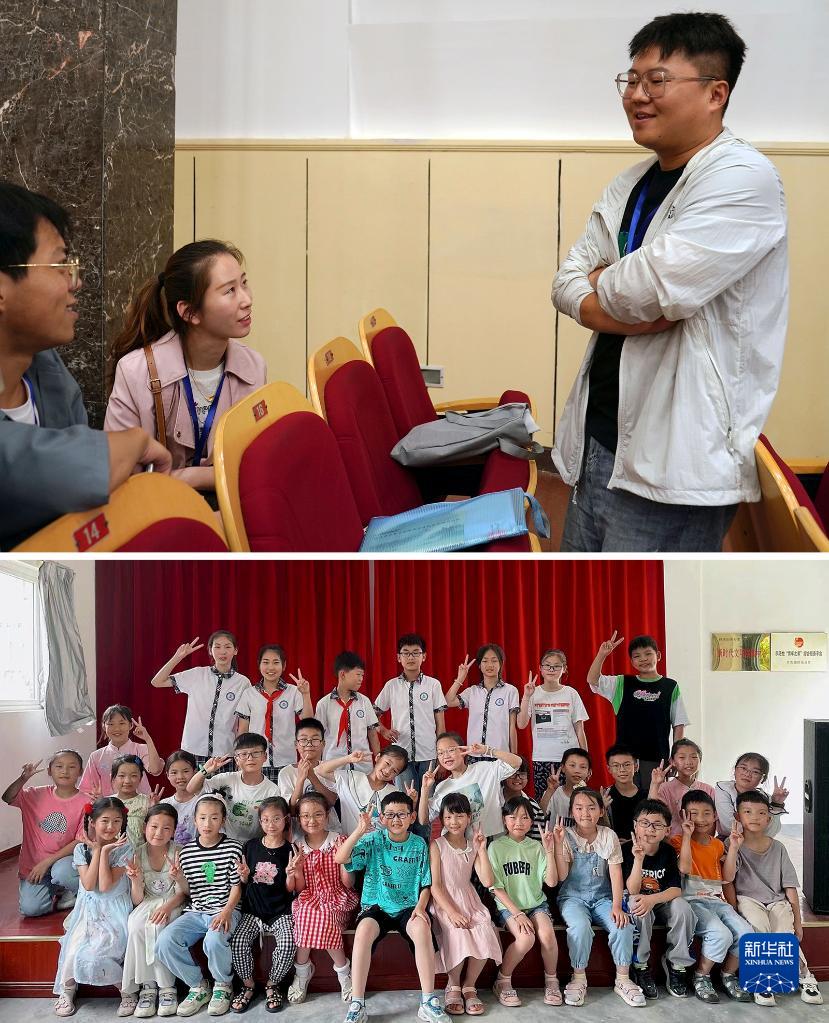 這是一張拼版照片:上圖為6月23日,參加培訓的安徽省六安市舒城縣曉天鎮中心小學(xué)的音樂(lè )教師翟緒磊(右)與其他學(xué)員交流(新華社記者劉穎攝);下圖為曉天鎮中心小學(xué)由翟緒磊老師組建并指導的曉小少年合唱團(受訪(fǎng)者供圖)。