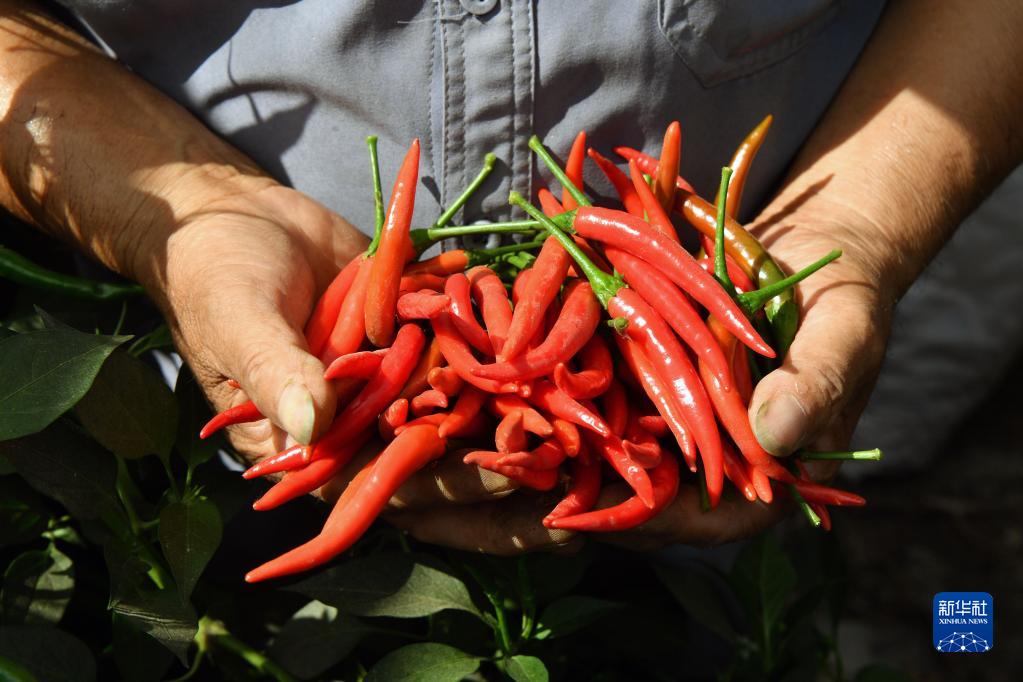 6月26日,村民在河南省安陽(yáng)市內黃縣梁莊鎮馮莊村的大棚里展示剛剛采摘的辣椒。