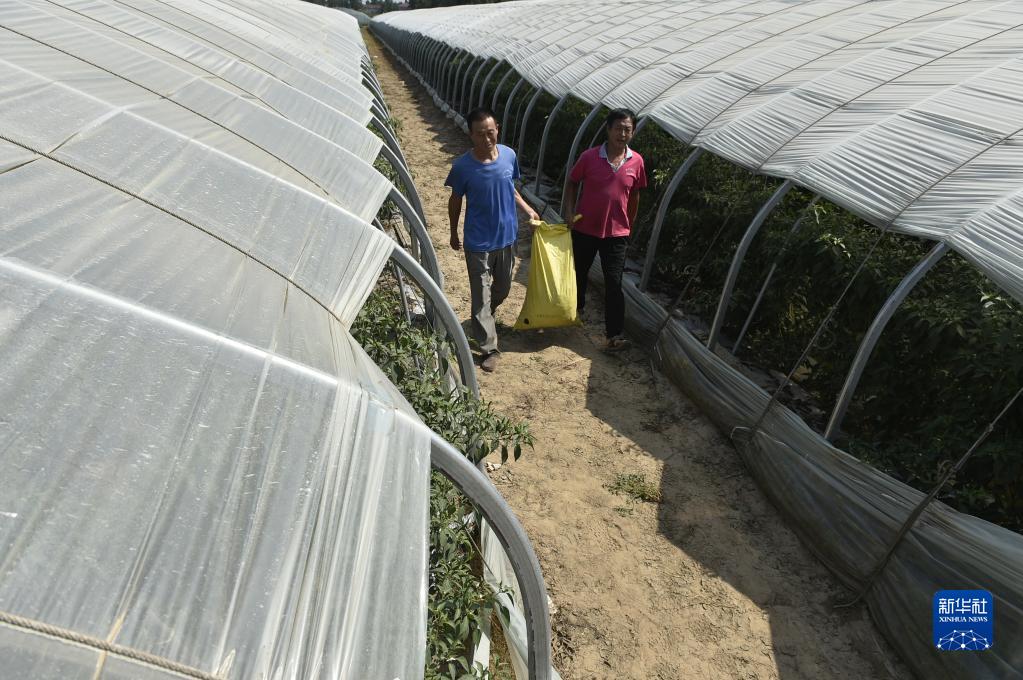 6月26日,村民在河南省安陽(yáng)市內黃縣梁莊鎮馮莊村的大棚間搬運剛剛采摘的辣椒。
